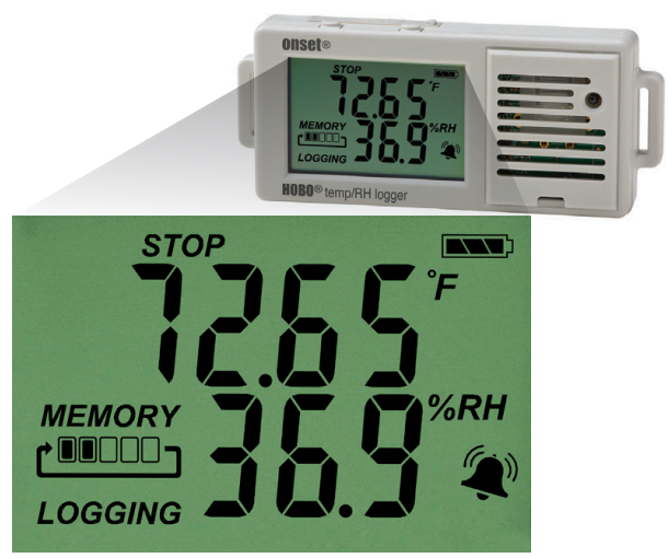 - Tampilan visual – Pencatat suhu dengan tampilan LCD memungkinkan Anda untuk mengkonfirmasi secara visual operasi logger dan status baterai di lapangan, menghilangkan kebutuhan untuk menghubungkan logger ke komputer untuk melihat informasi.