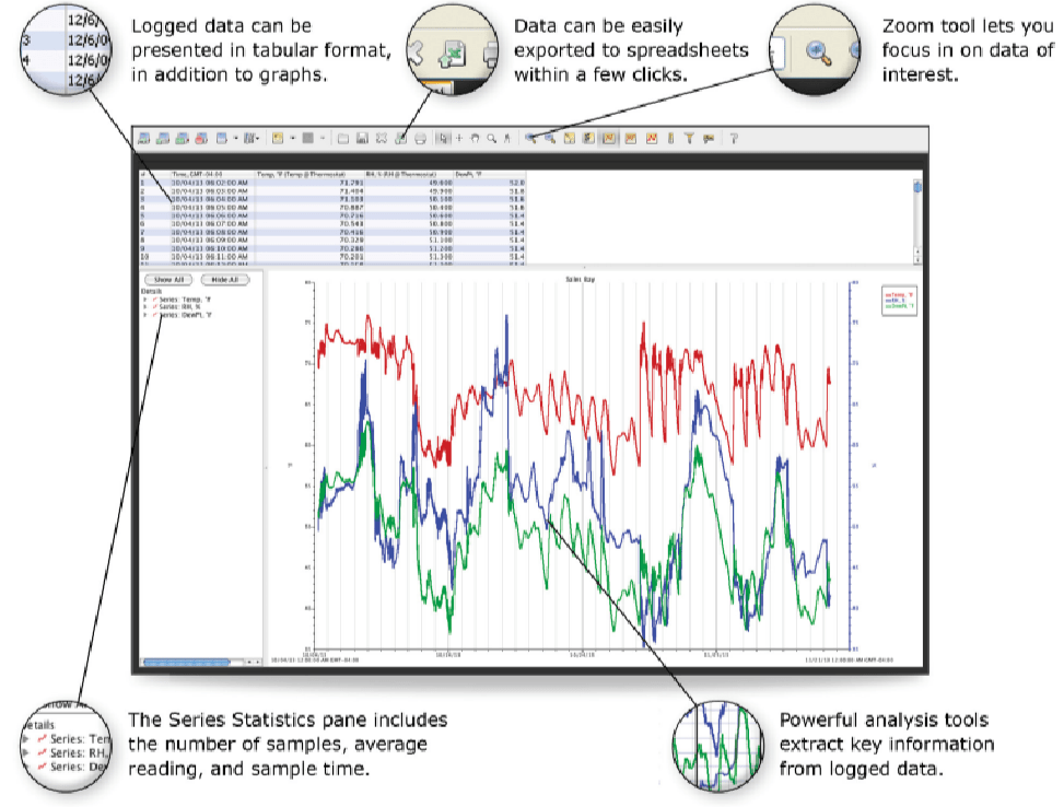 Paket perangkat lunak pencatatan data juga harus menawarkan perencanaan data yang kuat kemampuan, dengan kemampuan untuk dengan mudah menggabungkan, menambahkan, dan memotong data, dan mengaktifkan Anda untuk dengan mudah mengekspor data ke program lain, seperti Microsoft Excel, untuk analisis.