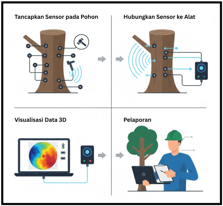 Pemeriksaan visual sering tidak cukup untuk mengungkap kondisi internal pohon karena banyak pohon yang tampak sehat ternyata menyimpan kerusakan di bagian dalam batang. Teknologi pemindaian akustik menjadi solusi non destruktif yang mampu memeriksa kepadatan dan kualitas kayu secara mendalam. ArborSonic 3D Acoustic Tomograph bekerja dengan sensor yang di pasang mengelilingi batang untuk membaca kecepatan rambat gelombang suara lalu mengubahnya menjadi visualisasi tiga dimensi yang akurat. Teknologi ini membantu mendeteksi rongga, peluruhan, dan retakan tersembunyi serta aman di gunakan karena tidak merusak jaringan pohon.