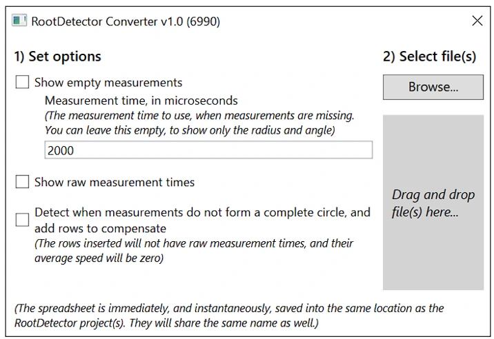 Root Detector Converter adalah software yang dapet mengonversi file .rdm (file hasil pengujian akar) menjadi file .xlsx. Software dapat diunduh di sini.