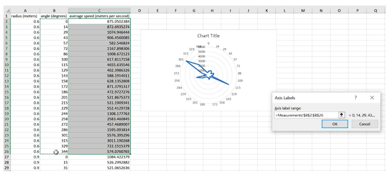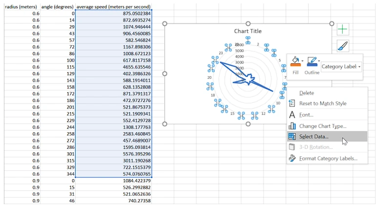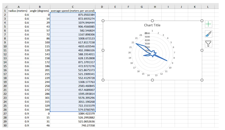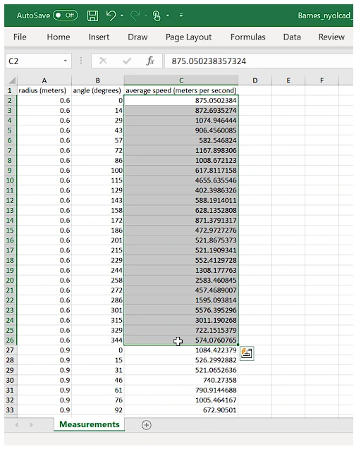 2. Buka file .xlsx di excel. akan ada kolom seperti radius (meter), sudut (derajat) dan kecepatan rata-rata (m/s).