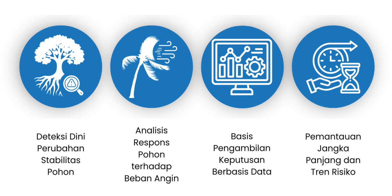 Setiap pohon merespons beban angin secara berbeda. Oleh karena itu, Tree Monitor memetakan respons tersebut secara kuantitatif untuk menilai tingkat elastisitas dan risiko kegagalan, terutama di area terbuka, tepi jalan, dan kawasan pesisir.