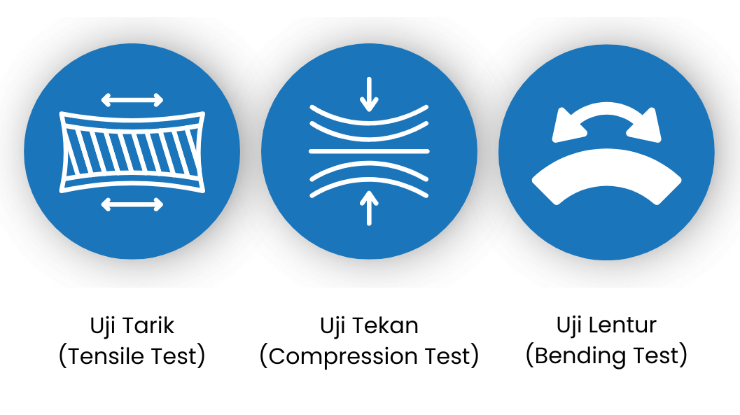 Digunakan untuk mengetahui kekuatan tarik maksimum material, modulus elastisitas, regangan maksimum, serta titik leleh. Pengujian ini sangat penting dalam menentukan apakah suatu material dapat menahan beban tanpa mengalami deformasi permanen.
