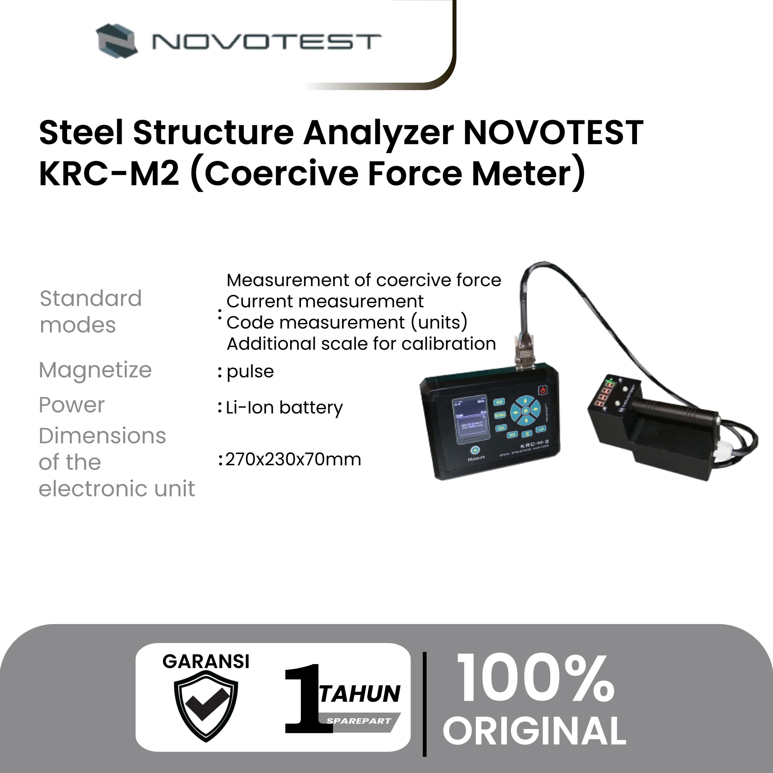 Steel Structure Analyzer NOVOTEST KRC-M2 dirancang untuk mengukur gaya koersif produk logam sesuai dengan IEC 60404-7 dan digunakan untuk pengujian non-destruktif dari perawatan kimia-termal, termal dan termomekanis, evaluasi sifat mekanik dan tegangan sisa.
