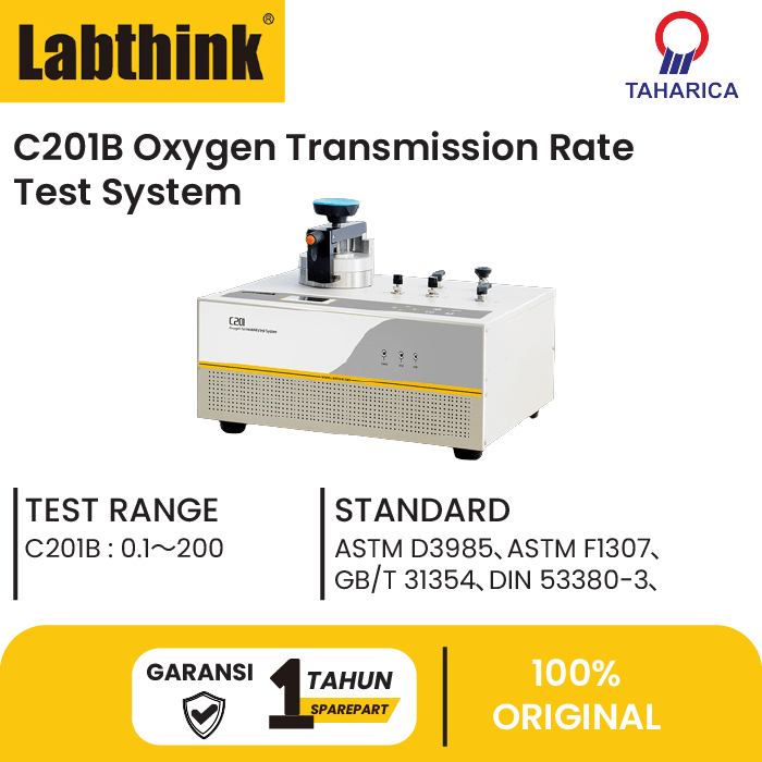 C201B Oxygen Transmission Rate Test System dirancang dan diproduksi berdasarkan metode sensor koulometrik dan sesuai dengan ASTM D3985. Instrumen ini dapat digunakan untuk mengukur laju transmisi oksigen dari bahan penghalang dengan sifat penghalang tinggi dan sedang dengan akurasi tinggi dan efisiensi tinggi. C201B berlaku untuk penentuan permeabilitas oksigen dari film plastik, terpal, kertas, dan bahan kemasan lainnya yang digunakan dalam makanan, farmasi, peralatan medis, produk konsumen, fotovoltaik dan industri elektronik, dll.