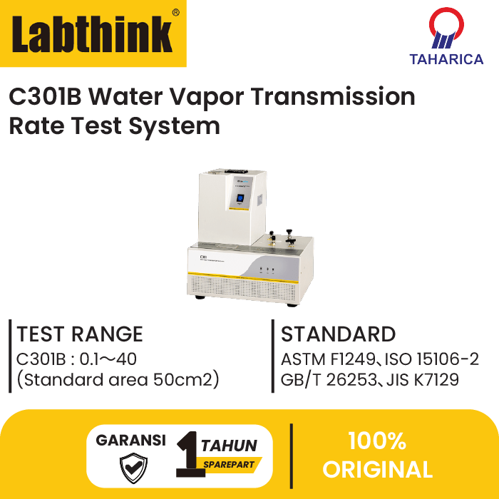 C301B Water Vapor Transmission Rate Test System dirancang dan diproduksi berdasarkan metode sensor inframerah dan sesuai dengan persyaratan ASTM F1249 dan ISO 15106-2. Instrumen ini dapat digunakan untuk mengukur laju transmisi uap air dari bahan penghalang dengan sifat penghalang kelembaban tinggi dan sedang dengan rentang pengujian yang luas dan efisiensi pengujian yang tinggi. C301B berlaku untuk penentuan permeabilitas uap air dari film plastik, terpal, kertas, paket dan bahan kemasan relatif lainnya dalam makanan, farmasi, peralatan medis, barang konsumsi, fotovoltaik dan industri elektronik, dll.