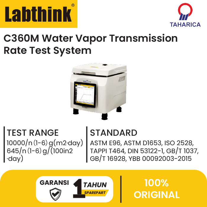 Sistem Uji Laju Transmisi Uap Air C360M, dirancang dan diproduksi berdasarkan metode penentuan gravimetrik dan sesuai dengan persyaratan ASTM E96. Instrumen ini dapat digunakan untuk mengukur tingkat transmisi uap air dari bahan penghalang dengan sifat penghalang kelembaban tinggi, sedang dan lebih rendah dengan jangkauan pengujian yang luas dan efisiensi pengujian yang tinggi. Instrumen ini menampilkan desain ruang uji Labthink yang dipatenkan dengan beberapa hidangan uji. C360M dilengkapi dengan piring uji presisi, keseimbangan yang sangat akurat, perangkat lunak profesional tertanam yang mendukung pengendalian suhu, kelembaban, dan laju aliran secara otomatis dan menjamin sensitivitas pengujian dan pengulangan hasil pengujian. C360M berlaku untuk penentuan permeabilitas uap air dari film plastik, terpal, kertas, paket dan bahan kemasan lainnya dalam makanan, farmasi, peralatan medis, bahan bangunan dan barang konsumsi, dll.