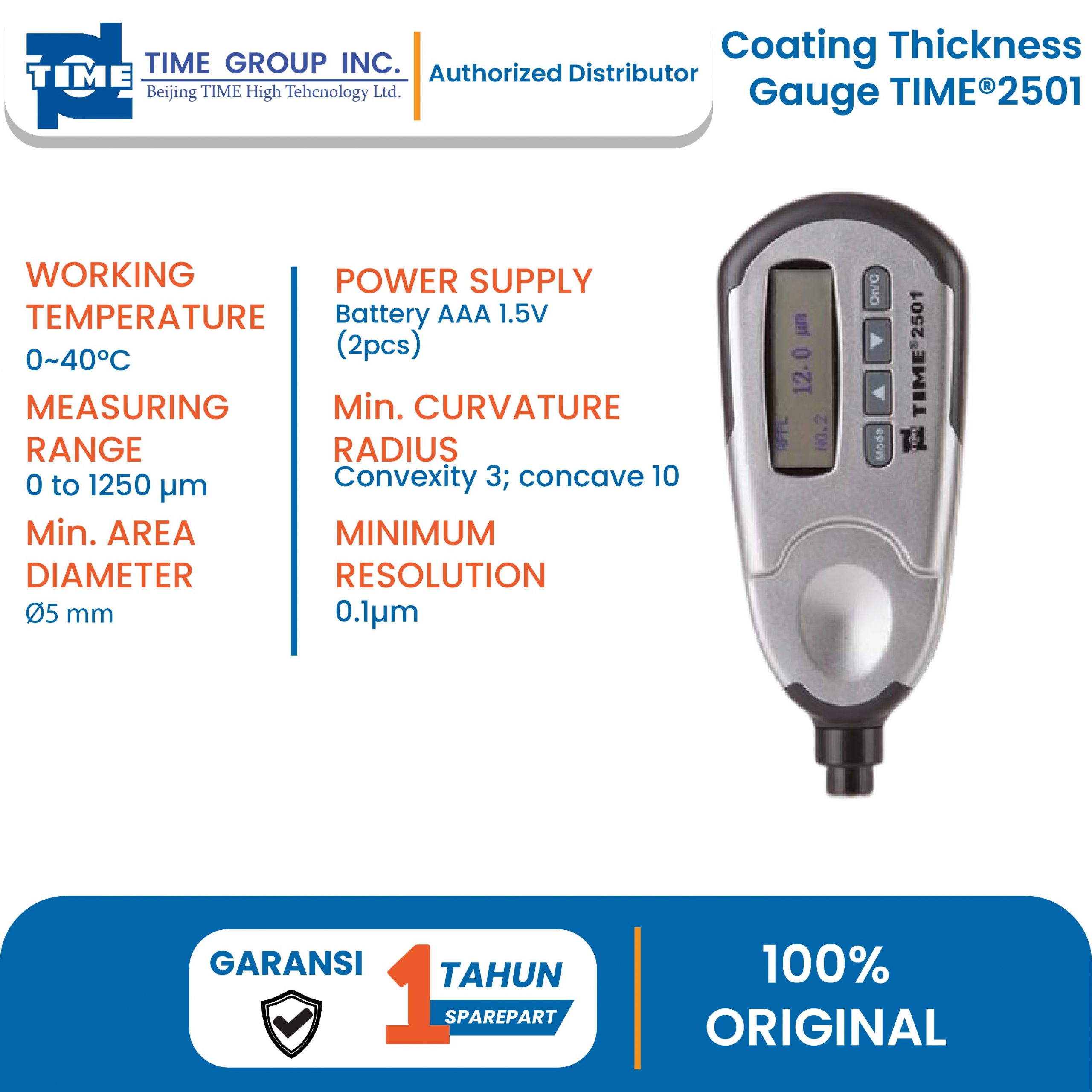 TIME2501 adalah pengukur super mini, yang mampu mengukur dengan cepat, tidak merusak dan tepat ketebalan lapisan isolasi pada dasar logam non-magnetik. Alat pengukur ketebalan ini mengadopsi prinsip arus eddy untuk mengukur ketebalan lapisan isolasi pada dasar logam non-magnetik (lapisan enamel, karet, cat dan plastik pada dasar tembaga, aluminium, seng, timah, dll.). Pengukur ketebalan lapisan TIME2501 dapat diterapkan secara luas di industri manufaktur, pengolahan logam dan kimia dan inspeksi komoditas. Karena ukurannya yang kecil dan integrasi probe dan instrumen, ini sangat berguna dalam pengukuran langsung di lokasi teknik.