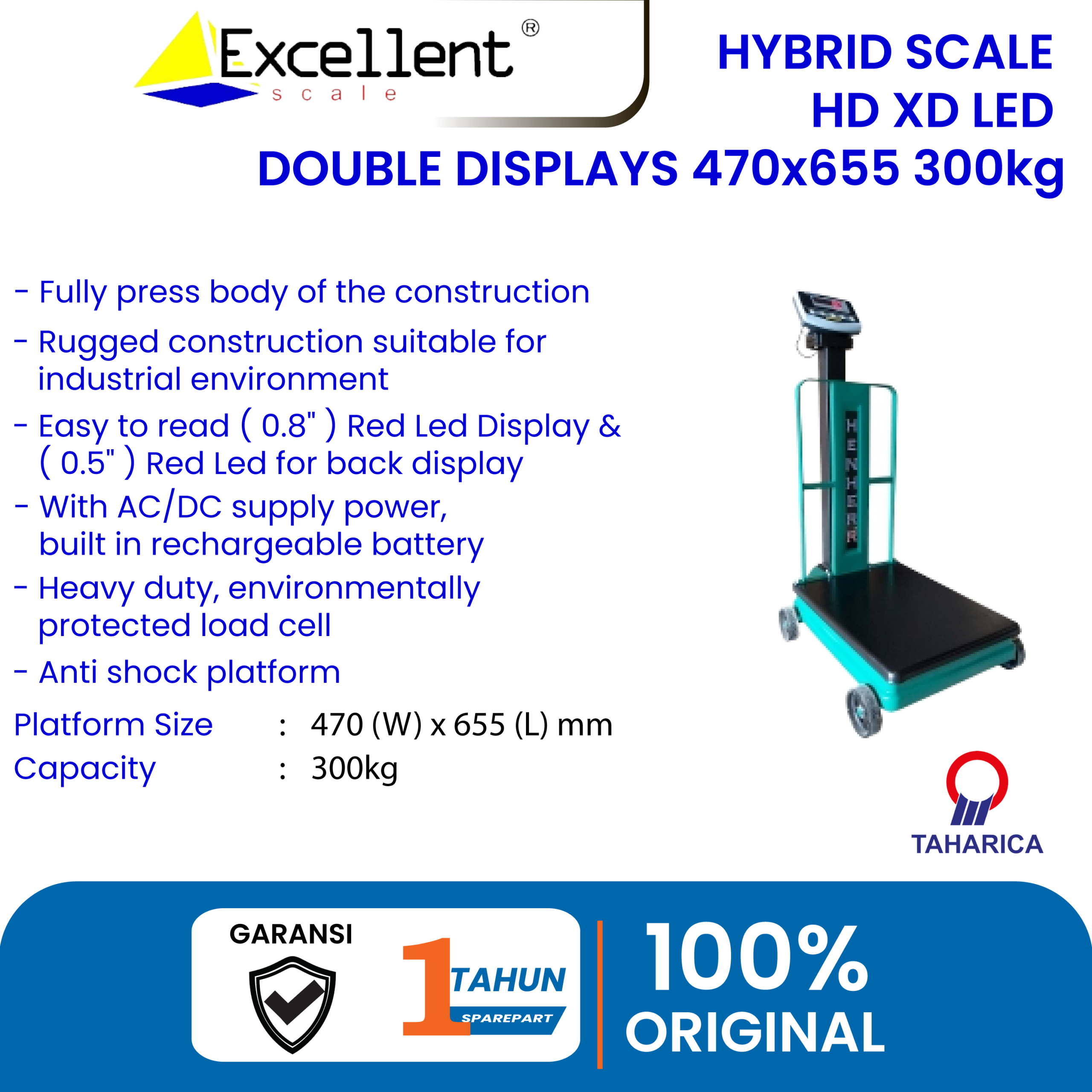 – Platform Size : 470 (W) x 655 (L) mm For capacity 300kg & 500kg