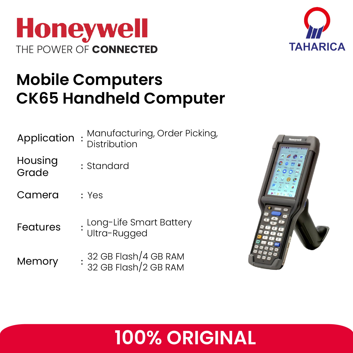 Dalam lingkungan pesanan yang semakin kecil dan kerangka waktu pengiriman yang semakin menyusut ini, Anda memerlukan cara untuk meningkatkan akurasi inventaris dan waktu siklus pemesanan. CK65 dibuat khusus untuk membantu mencapai tujuan tersebut dengan memaksimalkan produktivitas pekerja. Perpaduan sempurna antara keypad dan layar sentuh, ergonomis dan daya tahan, CK65 cukup ringan untuk digunakan sepanjang hari namun cukup tahan lama untuk menahan keausan penggunaan sehari-hari. Dan dengan baterai pintar diperpanjang 7.000 mAh, CK65 mampu beroperasi terus menerus hingga 28 jam, sehingga pekerja yang mendapati diri mereka dengan baterai mati di tengah-tengah shift mereka akan menjadi sesuatu dari masa lalu.