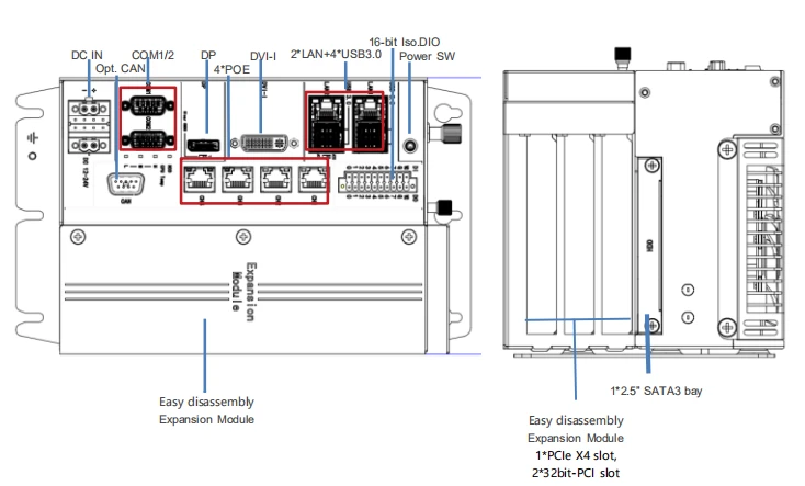 | I/O ports | 2*Gig-LAN(RJ45),4*POE (RJ45) 4*USB3.0(Type A) 1*MIO with CAN、Uart signal(DB9) 2*RS232/422/485 with TVS Iso. (DB9) 1*DP+1*DVI-I | |