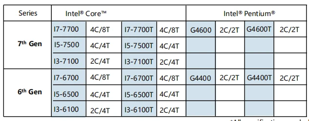 System | CPU | Gen.6th Intel® Skylake-S/gen.7th Intel® Kabylake-S Pentium/Core I3/I5/I7 CPU, LGA 1151 socket |
