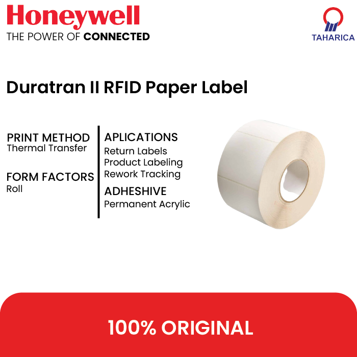 Label kertas transfer termal Honeywell adalah pilihan yang sangat baik untuk digunakan dalam aplikasi yang menuntut lingkungan, di mana label harus tahan terhadap kondisi seperti panas dan sinar matahari. Teknologi pencetakan transfer termal menggunakan pita tinta sensitif termal untuk menghasilkan barcode yang dapat dipindai dengan cahaya tampak dan inframerah . Duratran™: produk label transfer termal, tersedia dalam kertas dan facestock sintetis, memberikan pencetakan berkualitas tinggi yang tahan lama dan fleksibilitas tak terbatas. Untuk kinerja optimal, gunakan label dan tag transfer termal Duratran dengan pita Honeywell ThermaMAX
