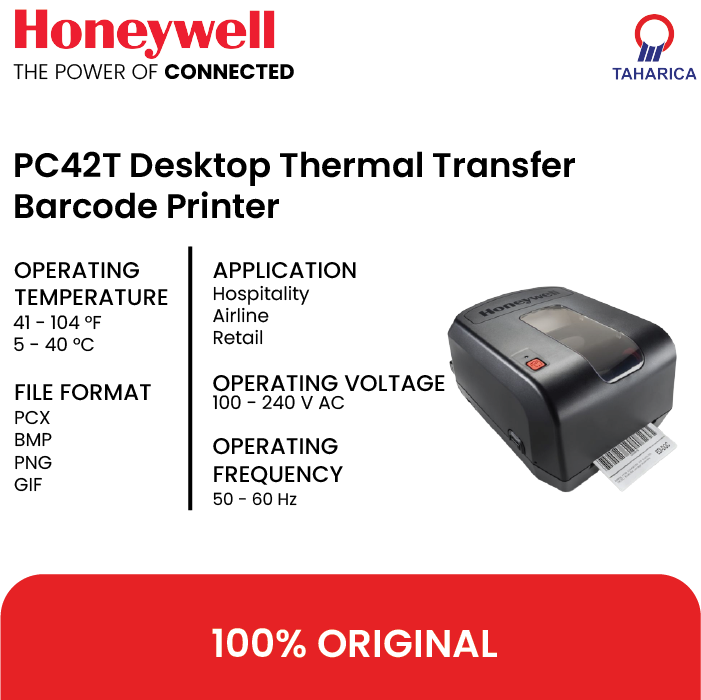 Printer Desktop Thermal Transfer PC42t menetapkan standar baru untuk kemudahan penggunaan dan keterjangkauan. Sangat ringkas dan mudah digunakan, printer ini mudah dipasang dan siap mencetak dengan cepat. Pengoperasian yang tenang, andal, dan desain intuitif menjadikan PC42t pas untuk aplikasi pelabelan tugas ringan di berbagai industri. Tersedia dalam konfigurasi inti pita 12,7 mm (0,5 in) atau 25,4 mm (1 in), printer PC42t mendukung media selebar 110 mm (4,3 in) dan pas dengan lingkungan pencetakan yang ada. Konfigurasi 25,4 mm kompatibel dengan panjang pita hingga 300 m (984 kaki): lebih dari empat kali panjang penawaran kompetitif. Ini mengurangi waktu henti dan berarti pita dapat dibagikan dengan printer yang lebih besar. Printer PC42t menyertakan konektivitas standar industri, dengan hingga empat port: perangkat dan host USB standar, ditambah serial atau serial+Ethernet opsional. Dengan kabel USB-ke-paralel yang dapat dipasang pengguna, printer PC42t dengan mudah masuk ke hampir semua lingkungan. Ukuran ringkas, dukungan untuk media umum serta emulasi ZPL-II dan EPL dan Honeywell Direct Protocol (DP), berarti bahwa printer PC42t adalah upgrade yang mudah dari berbagai printer Intermec lama dan printer kompetitif. Printer Desktop Thermal Transfer PC42t memiliki harga terjangkau, mencakup fitur-fitur modern, dan merupakan solusi cerdas untuk usaha kecil atau menengah yang ingin meningkatkan produktivitas dalam aplikasi pelabelan.