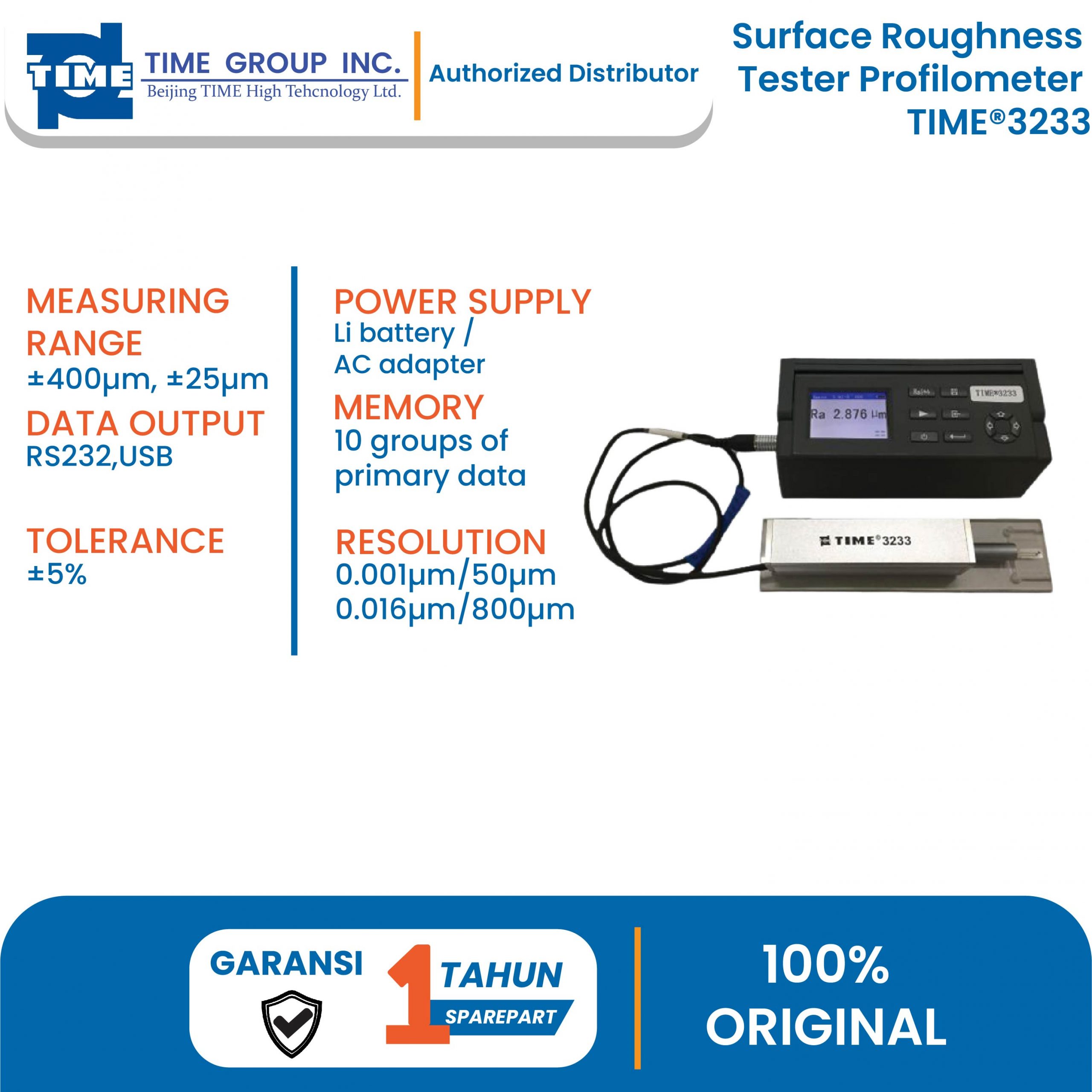 Seri TIME® 323X adalah instrumen pengukur kekasaran permukaan kelas atas yang canggih dengan rentang pengujian yang luas (±400µm) dan akurasi tinggi (toleransi±5%, pengulangan 3%). Sementara itu, fitur penguji kekasaran permukaan TIME® 323X dilengkapi dengan pengukuran tanpa selip, yang berarti dapat menjangkau bagian yang lebih kecil dan lebih sulit dijangkau daripada alat konvensional lainnya. Peralatan ini mendukung Hingga 55 parameter untuk kekasaran, gelombang, dan profil utama. TIME®3233 adalah penguji kekasaran permukaan tipe stylus portabel terbaru yang dikembangkan oleh TIME Group Inc. Driver terpisah membuatnya fleksibel untuk menangani spesimen yang berbeda. Panjang tracing 50mm dapat sepenuhnya menguji waveness.