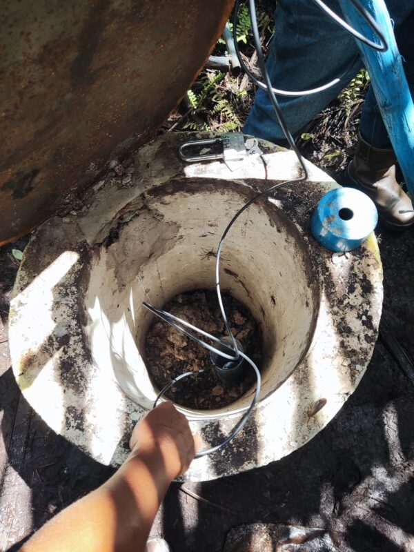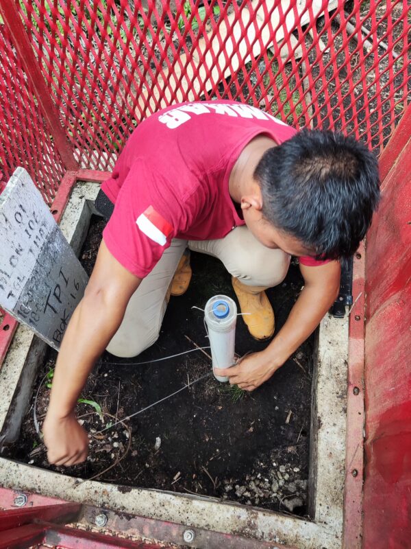 Proses instalasi water level logger di PT Marita Makmur Jaya di lakukan secara sistematis. Sensor HOBO U20L di turunkan ke dalam pipa pelindung di sumur pantau dengan kawat baja tipis sebagai penyangga. Teknisi memastikan posisi sensor tepat sambil menjaga kabel tekanan tetap rapi. Semua di lakukan di dalam kotak besi pelindung untuk mencegah gangguan dan vandalisme.