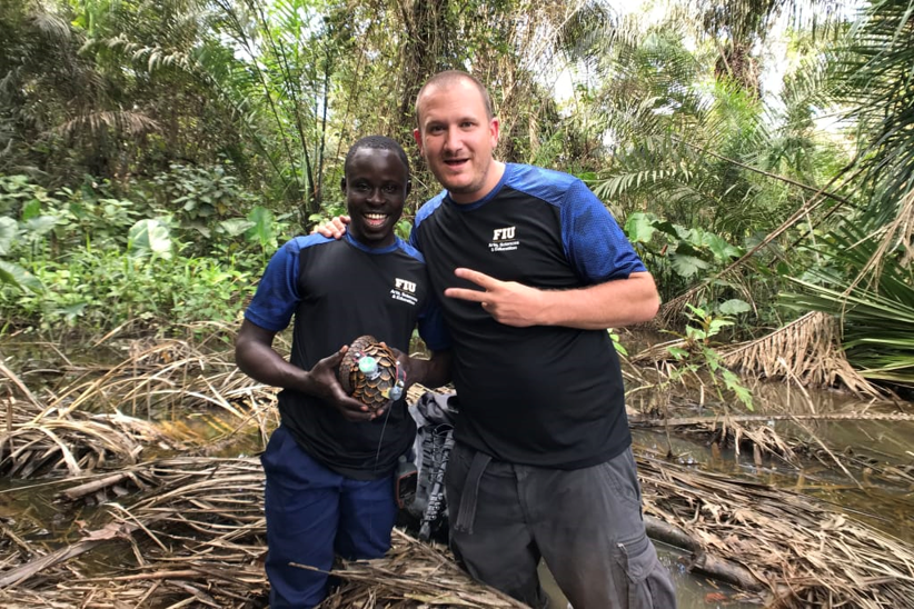 Mathieu Assovi (kiri) dan peneliti dari FIU, Matthew Shirley (kanan) sedang bersiap melepaskan trenggiling perut hitam pertama yang mereka beri tanda. Foto diatas oleh : Matthew Shirley.